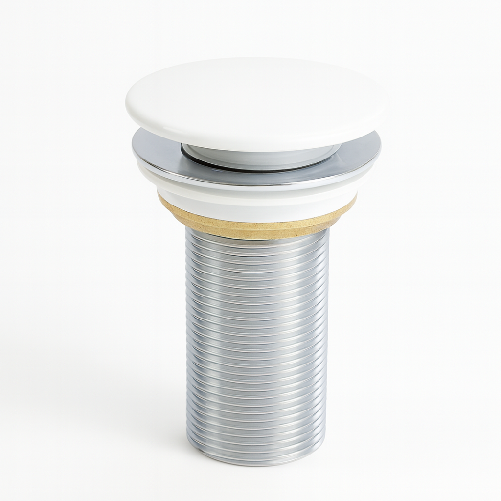 Górna część korka wykonana została z trwałego materiału pokrytego szkliwem w odcieniu białego połysku, idealnie dopasowanym kolorystycznie do umywalek ceramicznych Aquaterris. Korpus z mosiądzu i elementy stalowe gwarantują wysoką odporność na korozję i długą żywotność.
